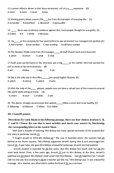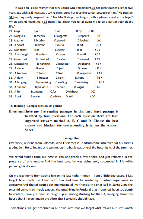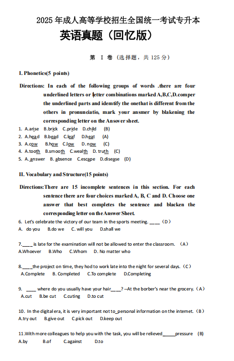 转载请注明:文章转载自 江西成考网 [http://www.ixuekao.com/]本文关键词: 2025年成人高考专升本英语真题答案解析